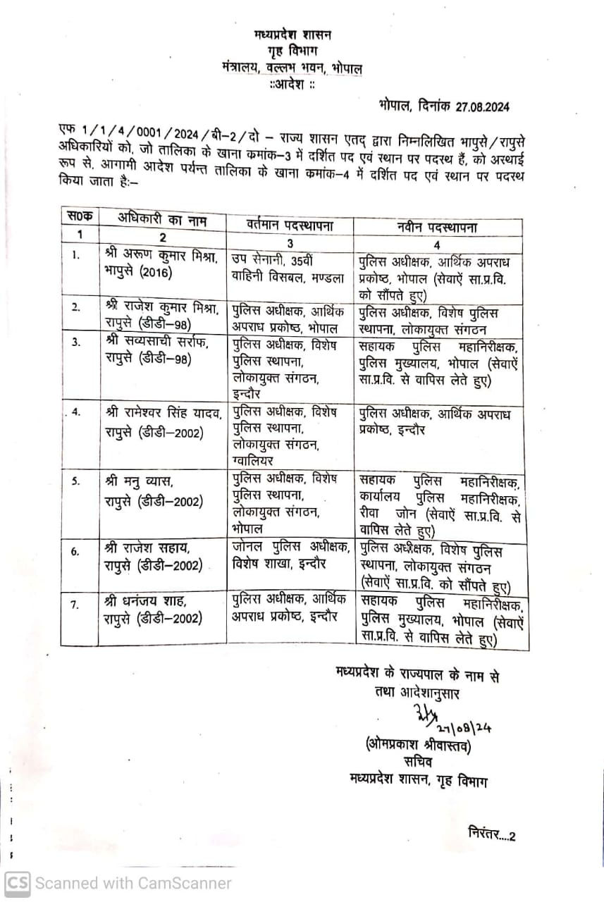 7 पुलिस अफसरों के ट्रांसफर अरुण कुमार मिश्रा अब ईओडब्लू भोपाल के एसपी
