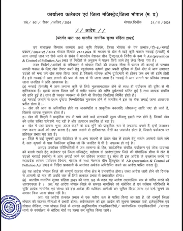 भोपाल में पराली जलाने पर रोक:कलेक्टर ने 2 महीने के लिए प्रतिबंध लगाया
