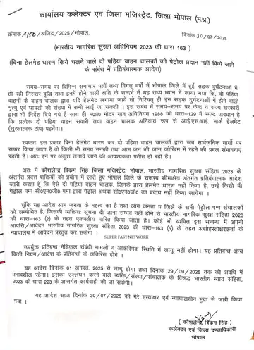 भोपाल में ‘बिना हेलमेट पेट्रोल नहीं’ आदेश का आज आखिरी दिन है। कलेक्टर कौशलेंद्र विक्रम सिंह ने 30 जुलाई को आदेश जारी किए थे। जिसे आगे बढ़ाया जा सकता है। इसके बाद जिला प्रशासन फिर से सख्ती करेगा।बता दें कि आदेश 29 सितंबर तक की अवधि के लिए था। इसका उल्लंघन करने वालों पर भारतीय न्याय संहिता की धारा 223 के अंतर्गत कार्रवाई का प्रावधान भी रहा।