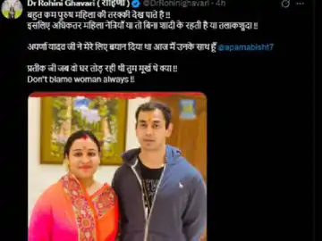 रोहिणी ने प्रतीक यादव को टैग करते हुए तीखा सवाल दागा- “प्रतीक जी, जब वो घर तोड़ रही थी, तब तुम मूर्ख थे क्या?” साथ ही उन्होंने यह भी लिखा कि हर बार महिलाओं को ही दोषी ठहराने की मानसिकता गलत है।