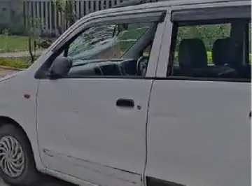 अस्पताल परिसर में खड़ी कार जिसमें तोड़फोड़ की गई।
