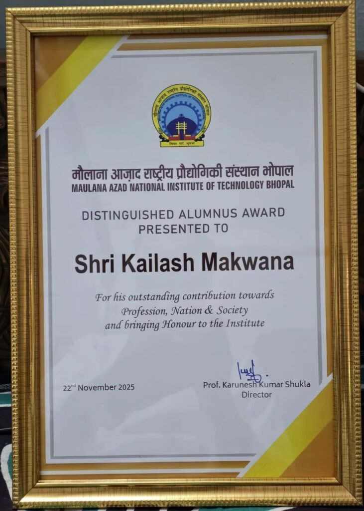 भोपाल: राष्ट्र और समाज के प्रति अपने उत्कृष्ट योगदान और संस्थान का गौरव बढ़ाने के लिए पुलिस महानिदेशक (DGP) कैलाश मकवाना को उनके गृह संस्थान मौलाना आजाद राष्ट्रीय प्रौद्योगिकी संस्थान (MANIT) भोपाल द्वारा प्रतिष्ठित ‘विशिष्ट पूर्व छात्र सम्मान (Distinguished Alumnus Award)’ से नवाजा गया।