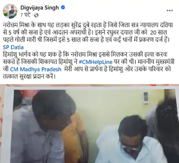 दिग्विजय ने दतिया एसपी को टैग करते हुए लिखा कि हिमांशु भार्गव को यह शक है कि नरोत्तम मिश्रा और सुरेंद्र दुबे मिलकर उसकी हत्या करा सकते हैं, जिसकी शिकायत हिमांशु ने सीएम हेल्पलाइन पर की थी।