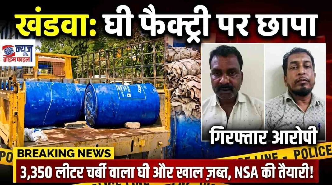खंडवा। शहर के इमलीपुरा क्षेत्र में प्रशासन ने एक बड़े गिरोह का भंडाफोड़ करते हुए जानवरों की चर्बी से नकली घी बनाने वाली फैक्ट्री पर छापेमारी की है। सिटी मजिस्ट्रेट बजरंग बहादुर के नेतृत्व में हुई इस कार्रवाई में करीब 3,350 लीटर मिलावटी घी बरामद किया गया, जो 69 टीन के डिब्बों और 9 ड्रमों में भरा था।