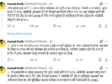 मेरी सरकार गिरने के बाद ओबीसी के खिलाफ षड्यंत्र शुरू हुआ कमलनाथ ने लिखा- यह मध्य प्रदेश में ओबीसी वर्ग के प्रति लिया गया सबसे बड़ा और ऐतिहासिक फैसला था। लेकिन बाद में मेरी सरकार को षड्यंत्रपूर्वक गिरा दिया गया और मार्च 2020 में शिवराज सिंह चौहान के नेतृत्व में भारतीय जनता पार्टी की सरकार बनी। भाजपा सरकार ने ओबीसी के खिलाफ षड्यंत्र शुरू किया। हाई कोर्ट का आदेश सिर्फ कुछ पदों पर लागू होना था लेकिन भाजपा सरकार ने पूरे प्रदेश में सभी जगह यह आदेश लागू कर 27% आरक्षण की हत्या कर दी।