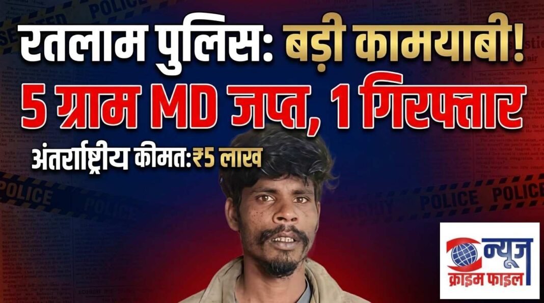 रतलाम। अवैध मादक पदार्थों के खिलाफ चलाए जा रहे विशेष अभियान के तहत डीडी नगर थाना पुलिस को बड़ी सफलता मिली है। पुलिस ने बाजना बस स्टैंड स्थित भील धर्मशाला के पास घेराबंदी कर एक युवक को 5 ग्राम एमडी (मेफेड्रोन) के साथ गिरफ्तार किया है। बरामद नशे की अंतरराष्ट्रीय कीमत करीब 5 लाख रुपए बताई जा रही है।