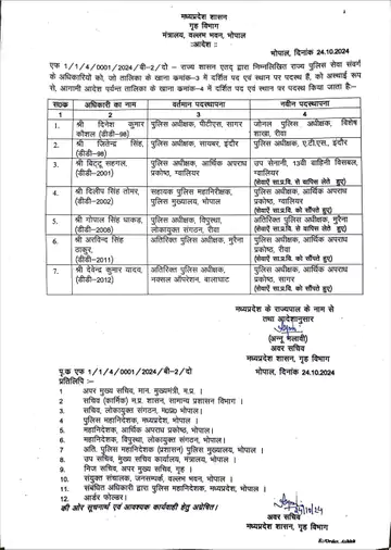 एसपी, पीटीएस (सागर) दिनेश कुमार कौशल को जोनल पुलिस अधीक्षक, विशेष शाखा, रीवा भेजा गया है। एसपी, साइबर (इंदौर) जितेंद्र सिंह को एसपी, एटीएस (इंदौर) बनाया गया। एसपी, विपुस्था, लोकायुक्त संगठन (रीवा) गोपाल सिंह धाकड़ को अतिरिक्त पुलिस अधीक्षक (मुरैना), जबकि मौजूदा अतिरिक्त पुलिस अधीक्षक (मुरैना) अरविंद सिंह ठाकुर को एसपी, ईओडब्लू (रीवा) की जिम्मेदारी दी गई है।