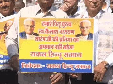 स्व. सारंग की प्रतिमा अटल पथ के पार्क में रखी है। प्रतिमा का अनावरण नहीं होने के कारण उसे कपड़े से ढंककर रखा गया था। पांच दिन पहले असमाजिक तत्वों ने आग लगाई थी। इस मामले में आरोपियों का सुराग नहीं लगा है। इस बीच बुधवार दोपहर में सकल हिंदू और कायस्थ समाज ने प्रदर्शन किया। दोपहर 12 बजे समाज के कई लोग रोशनपुरा चौराहे पर पहुंचे और प्रदर्शन शुरू किया।